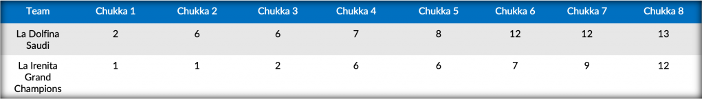 Taking advantage of La Irenita Grand Champion’s foul troubles in the fifth, Cambiaso converted a perfect 4 for 4 from the line for La Dolfina Saudi, while La Irenita Grand Champions managed just one penalty goal in the sixth from Britos despite three La Irenita Grand Champion attempts. Trailing by five, Zubia and Elizalde kick-started La Irenita Grand Champion’s comeback bid, as Zubia turned up the pressure on La Dolfina Saudi to score three unanswered goals. Racing towards the end of regulation, La Dolfina Saudi’s final defensive stand held to ultimately claim the Ayrshire Cup 13-12.