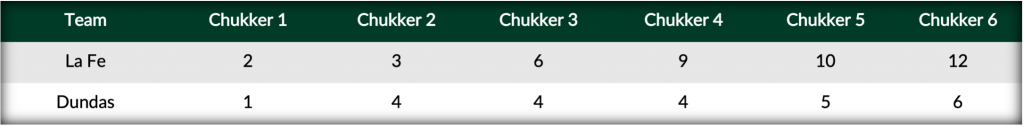 Facing each other for the first time in the tournament, the two evenly matched teams match each other stride-for-stride, with La Fe establishing an early lead on field goals from Arellano and Jackson. Taking advantage of La Fe’s foul troubles in the second, Cambiaso converted twice from the line boosting Dundas to 4-3 advantage. Answering in the third, goals from Jackson and Arellano complimented a defensive shoutout to re-gain La Fe’s lead 6-4 at the break.