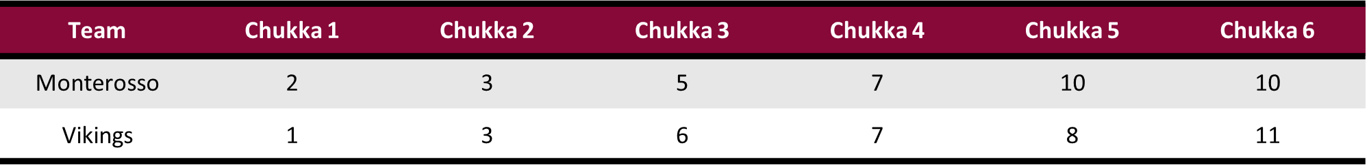 A foul-ridden game featured numerous opportunities from the penalty line for both teams, where Monterosso finished eight for 12, while Vikings converted six of their eight attempts. In a game decided by the narrowest of margins, the two missed penalties in the sixth chukka for Monterosso proved to be the difference in the back-and-forth match. Zubia led all players with six goals, all from the penalty line, but it was the play of Sebastian Merlos that helped carry Vikings to victory, producing an impressive five field goals on 83% shooting in the thrilling 11-10 win.