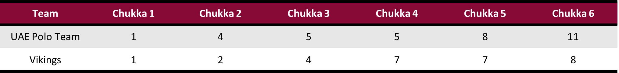 Carrying over the success from the third chukka, Vikings surged into the lead due to the accurate penalty shooting from Zubia, adding three penalty goals in a fourth chukka where they dominated possession. Holding UAE Polo Team scoreless, Vikings’ 7-5 advantage left them two chukkas away from capturing their second victory, but foul trouble changed the dynamic of the game. Scoring just one field goal in the entire second half, UAE Polo Team’s offense came from the penalty line, sending all three attempts through the goal posts to retake the lead at 8-7. Castagnola opened the scoring in the final chukka to complete a run of four unanswered goals for UAE Polo Team. Despite the best efforts of Vikings, UAE Polo Team secured the victory with two late penalty conversions for Cappella to capture the 11-8 victory.