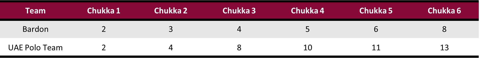Bardon continued to produce scoring opportunities but were unable to find the goal posts, converting just one of their first eleven shots in the second half. Despite not winning the possession battle, UAE Polo Team extended their lead to five with Castagnola contributing two goals and an assist over the fourth and fifth chukkas. Completing his strongest performance of the tournament, Castagnola sent a Penalty 4 through the goal, while also adding a field goal in the sixth chukka to secure the victory. Despite the best efforts of Bardon, their shooting inaccuracy ultimately proved to be their downfall in the 13-8 defeat.