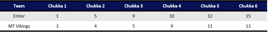 Reorganizing during the halftime break, MT Vikings slowed the Emlor attack with Sebastian Merlos leading the defensive effort, allowing Zubia and Mackenzie to drive forward. The change in strategy led to a four-goal chukka for MT Vikings and quickly reducing the lead from four to just one to set up an exciting final two chukkas. Displaying end-to-end polo, Emlor and MT Vikings exchanged goals with Bigatti leading the charge for Emlor and Zubia responding with a goal and an assist for MT Vikings. Maintaining their one-goal lead into the sixth chukka, Emlor secured the win after McCarthy capped off a strong performance with his third goal to finish with the 15-13 victory.
