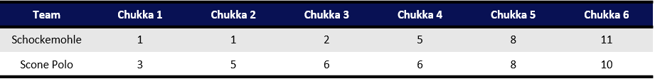 Trailing 6-1 early in the game, Schockemohle displayed a resilient effort to fight back against a Scone team led by Adolfo and Poroto Cambiaso. Overcoming inaccuracy in the first half, Schockemohle produced twice as many shots as Scone in the second half while shooting 50% from the field and adding three penalty conversions. Scone dominated play in the first half by using an accurate passing attack that resulted in high-quality chances at goal, but possession switched to Schockemohle throughout the second half. Maleitzke led all players with six goals, including four of the final six goals of the game to capture the thrilling 11-10 victory.