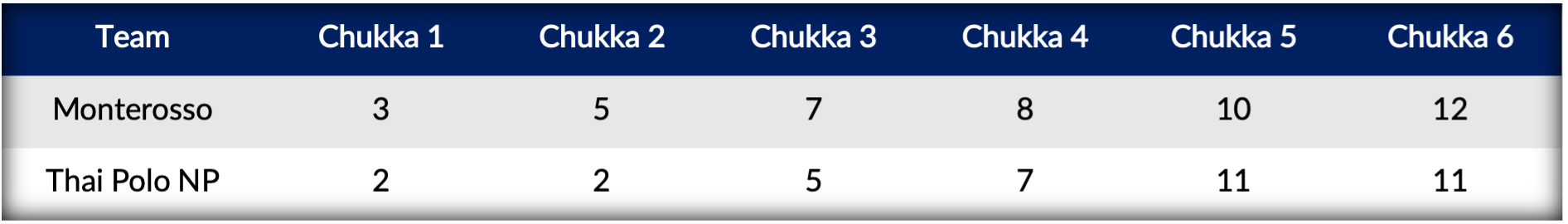 Remerging from the break, Ned Hine took advantage of Monterosso’s foul differential, sending his second conversion of the match through the posts. Despite a goal from Louis Hine to keep play close, a crucial conversion for Toccalino allowed Monterosso to maintain a one goal advantage. Pushing hard to gain the upper hand in the fifth chukka, Thai Polo NP’s offensive effort combined for four-goals, with three coming off the mallet of Ned Hine. Not to be denied in the field, Toccalino’s power in the field provided a two-goal response to keep Monterosso in the lead. Displaying an impressive shutout defensive effort in the final chukka of regulation, Monterosso held Thai Polo NP to just three shots, with Toccalino and Matias Gonzalez capping off the hard-fought contest to score one goal each and seal Monterosso’s 12-11 victory.