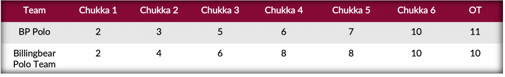 Building off three penalty conversions in the first half, foul trouble for BP Polo sent Garcia back to the penalty line once more to convert from the 30-yard line for the first of Billingbear Polo Team’s two goals in the fourth chukka. After a quiet first half, BP Polo’s Rufino Bensadon added his name to the scoresheet, posting two goals to keep his team within one. Putting together their strongest chukka of the contest, BP Polo began a comeback bid with the first of two penalty conversions from Ringa to outscore their opponents for the first time in the match. However, Billingbear Polo Team’s Garcia and Huidobro kept their team in the lead 10-9. Coming down to the last bell, a final goal from Bensadon sent this tight match into overtime. Holding Billingbear Polo Team shotless in the extra chukka, a first attempt from Bensadon missed the line, but a second drive was all that was needed for Bensadon to sink a golden goal to complete BP Polo’s comeback and deliver a thrilling 11-10 victory.