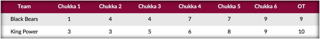 Resuming play in the Queen’s Cup, King Power established an early advantage from the field on contributions from Manuel Elizalde and Nicolas Pieres. Responding with a shutout chukka in the second, Black Bears were on the attack as back-to-back efforts from Juan Martin Nero was followed by Guy Schwarzenbach to vault their team into the lead 4-3. Curbing Black Bear’s offensive momentum, it was King Power’s turn to hold their opponents to only three shots in the field, as a two-goal chukka reclaimed a narrow 5-4 advantage for King Power at the half. Following a quick goal from Pieres to kick-start the fourth, a reenergized Black Bears went on a three-goal run led by Nero in open play. Matching each other stride-for-stride in shots and penalty attempts, substitute Jeronimo de Carril led King Power from the line, as Black Bears’ Oliver Cudmore was followed by Schwarzenbach to force overtime tied 9-all. Leading King Power with four assists in the match and second in scoring with two goals, de Carril stepped up to the line for his second penalty attempt on the day and had no troubles sinking the golden goal, delivering King Power the 10-9 victory to remain undefeated in the competition.