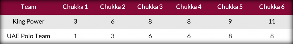 In one of the fastest chukkas in polo, both King Power and UAE Polo Team shot at goal but were unable to find the mark as only a single whistle blew over the seven and a half minutes of play, yet no goals were scored leaving King Power ahead by two. Turning to Tomas Beresford, UAE Polo Team made their first charge of the match in an attempt to tie the score, receiving one penalty goal and a field goal to trail by just one. In arguably his best showing of the season, Mackenzie Weisz’s fourth goal on a Penalty 3 conversion helped King Power seal the 11-8 victory and match UAE Polo Team with a 2-1 record atop League Two.