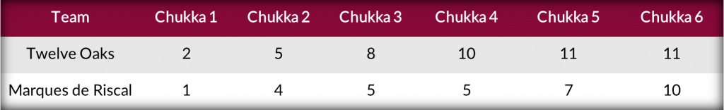 Foul trouble for Marques de Riscal in the opening moments of the second half resulted in the momentum staying with Twelve Oaks after consecutive penalty conversions suddenly put Twelve Oaks firmly in the lead, ahead 10-5. Looking like they were on their way to victory, Twelve Oaks found themselves in foul trouble of their own, committing 10 fouls over the final two chukkas and providing Marques de Riscal the opening they needed. Held without a field goal over the final four chukkas, Marques de Riscal challenged Twelve Oaks in the final moments after scoring five penalty goals but fell a goal short as Twelve Oaks survived the late push to capture their second victory and keep their quarterfinal aspirations alive.