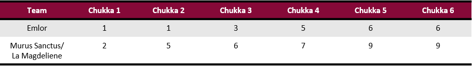 Determined to make a push to begin the second half, Emlor turned to Spencer McCarthy, who scored back-to-back goals to bring his team within one goal, their closest gap since the opening chukka. However, the Murus Sanctus/La Magdeleine defense increased their pressure to limit any available space for Emlor and preventing them from finding the goal over the final two chukkas. Matt Perry added his second goal while Caset capped off a strong performance with a goal and an assist to give Murus Sanctus/La Magdeleine the 9-6 lead entering the sixth chukka. Maintaining their focus on defense, Murus Sanctus/La Magdeleine prevented any runs to goal and kept Emlor at a distance to capture their first victory of the tournament.