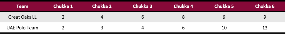 Trailing throughout much of the game, UAE Polo Team raced into the lead in a dominant fifth chukka, scoring four goals, three coming from Polito Pieres, while a stunned Great Oaks LL were unable to respond in a scoreless sixth chukka. Leading all players with eight goals, Pieres converted five of his penalty attempts while helping UAE Polo Team control possession alongside Tommy Beresford and Tomas Panelo. Foul trouble for Great Oaks LL in the fourth and fifth chukkas ignited the UAE Polo Team offense who produced nine of their 13 goals in the second half while shooting 56% to claim the 13-9 victory.