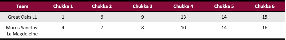 Effectively coordinating their two-man game in the first chukka, Caset and Sola combined for four goals and two assists to take the early lead on Great Oaks LL. With quick runs to goal, Murus Sanctus-La Magdeleine held the early advantage from the field, but Great Oaks LL responded in the second chukka with constant pressure from fast, passing attack to attempt eight shots on goal, resulting in all four players finding the scoresheet. Guillermo Terrera added a second goal to complete a strong chukka for Great Oaks LL, but Murus Sanctus-La Magdeleine managed to hold onto a one-goal lead. Carrying over their momentum from the second chukka, Great Oaks LL scored the first three goals of the third chukka with their well-rounded attack to push into the lead and complete the half with the 9-8 advantage.