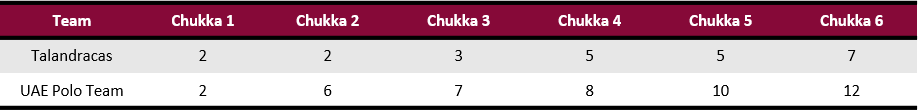 A determined effort from Talandracas was led by Castangola as he provided a goal and an assist in the fourth chukka in hopes of reducing the gap on the scoreboard. While they were able to inch a goal closer, Talandracas’ inaccurate shooting in the second half, converting two of their 10 shots, prevented them from challenging UAE Polo Team late in the game. Displaying an organized defense, UAE Polo Team added to their lead thanks to the play of Beresford, who produced four unanswered goals to finish with a game-high seven and secure the 12-7 victory for UAE Polo Team as they remain undefeated with a 3-0 record.