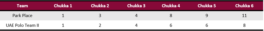 A foul ridden start to the second half resulted in the first five goals all coming from the penalty line, three in favour of Park Place and two for UAE Polo Team II as the whistles slowed play. Britos pushed Park Place’s lead to two before the end of the fourth chukka with UAE Polo Team II trying to close the gap. Unable to convert any of their five shot attempts in the fifth chukka, UAE Polo Team’s struggles in open play prevented them from pulling even. Two missed penalty attempts for Park Place gave UAE Polo Team II hope entering the final chukka, but Britos led the Park Place attack over the final moments. Back-to-back field goals in the sixth chukka secured the 11-8 victory for Park Place as they await next weekend’s quarterfinals in their quest to reach the final.