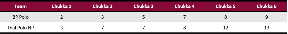 A fast-paced match featured end-to-end action with 40 combined shots between the two teams with the sole difference in the game coming from accuracy to goal. Thai Polo NP converted 50% of their attempts while BP Polo managed just 23% shooting. The closely matched game ultimately came down to the final two chukkas with Thai Polo NP effectively converting their chances, led by the seven-goal performance from Juan Gris Zavaleta. The accurate passing and conversion around goal in the late stages pushed Thai Polo NP to their first victory.