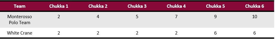 With their sights set on maintaining their undefeated record, Monterosso Polo Team raced out of halftime with a quick pace that produced six shots on goal, but only Mackenzie Weisz found the goal. Yet to convert on any of their eight shot attempts, White Crane struggled to keep pace as their scoreless drought carried into the fifth chukka. That abruptly changed when a Penalty 4 conversion from Nico Pieres gave White Crane their first goal and seeing the ball sail through the goal posts seemed to awaken the White Crane offense. Pieres and James Harper combined to add three field goals on perfect shooting to pull within three and provide the team with hope entering the final chukka. In need of another strong chukka, White Crane shot at goal at any opportunity but were left without a goal as a strong defensive performance from Monterosso Polo Team carried them to the 10-6 victory.