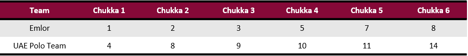 Held without a field goal in the first half, Emlor finally broke through in the fourth chukka, receiving field goals from Merlos and Spencer McCarthy, but the difference on the scoreboard remained at five as UAE Polo Team continued to limit the scoring opportunities for Emlor. Trading penalty conversions, Merlos and Beresford provided the only offense for their teams as Emlor continued to inch closer, trailing by four, but it was as close as they would get as UAE Polo Team completed an exceptional debut with a strong sixth chukka. Two goals from Beresford and one from Lavinia in the final chukka capped off the 14-8 victory in favour of UAE Polo Team.