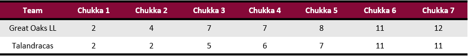 A battle between brothers, Bartolome and Camilo Castagnola led their teams with six and eight goals respectively, fighting to propel their teams to victory. Producing nearly identical statistics from the field, Great Oaks LL held the edge from the penalty line, converting five goals on eight attempts in what proved to be the narrow difference in the game. A thrilling sixth chukka featured seven goals between the two teams to send the game into overtime, but it was Great Oaks LL who continued to pressure Talandracas to emerge as the winner in the hard-fought 12-11 win.