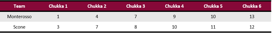 Completing the comeback from the early deficit, David Stirling took the first throw-in of the second half in for a goal to tie the score, but an experienced Scone Polo team responded with pressure of their own. Strada added two penalty goals, while Cambiaso continued to produce with his fifth goal, finishing a perfect 4 for 4 from the field. Holding a one-goal lead in the sixth chukka, a dangerous riding foul awarded Strada a second yellow, leaving Scone Polo a player short. Moments later, Cambiaso was sent off with a second yellow after a dangerous use of mallet on a hook attempt, leaving a rare sight of just two Scone Polo players on the field. Penalty conversions on both yellows allowed Monterosso to pull ahead by one and while playing four on two, Stirling found the goal to put Monterosso ahead by two. Returning to play, Strada was able to bring Scone Polo back within one, but they ran out of time to tie the score, leaving Monterosso to move to the top of League Three with the 13-12 victory.