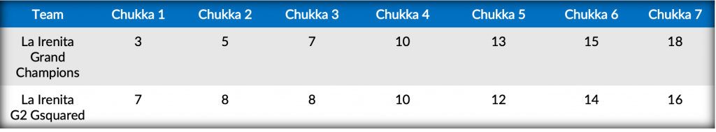 Contributing twice from the field, Loza provided the offensive efforts for La Irenita G2 Gsquared in the fifth, but foul troubles persisted for La Irenita G2 Gsquared, with Britos adding two more conversions, as a drive from Zubia pushed La Irenita Grand Champions into the lead 13-12. Trading goals in the sixth between La Irenita G2 Gsquared’s Dabas and Mac Donough and Britos, the emergence of Mac Donough would prove crucial in the final chukka of regulation, as three goals off the mallet of Mac Donough from the field sealed the 18-16 win.