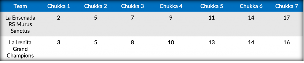 Awarding La Ensenada RS Murus Sanctus two-goals on handicap, La Irenita Grand Champions began a strong first-half on three consecutive goals, including two conversions from Britos. Mounting a response in the second chukka, La Ensenada RS Murus Sanctus outscored their opponents on a three-goal run of their own commanded by Sola in the field. La Irenita Grand Champions’ leading scorer Britos was back on the attack contributing from both the line and open play to give his team a narrow 8-7 advantage. Trading goals from Britos and Caset in the fourth, the two teams finished the first half with nearly identical shooting percentages, but five successful conversions for La Irenita Grand Champions allowed them to end the half on top 10-9.
