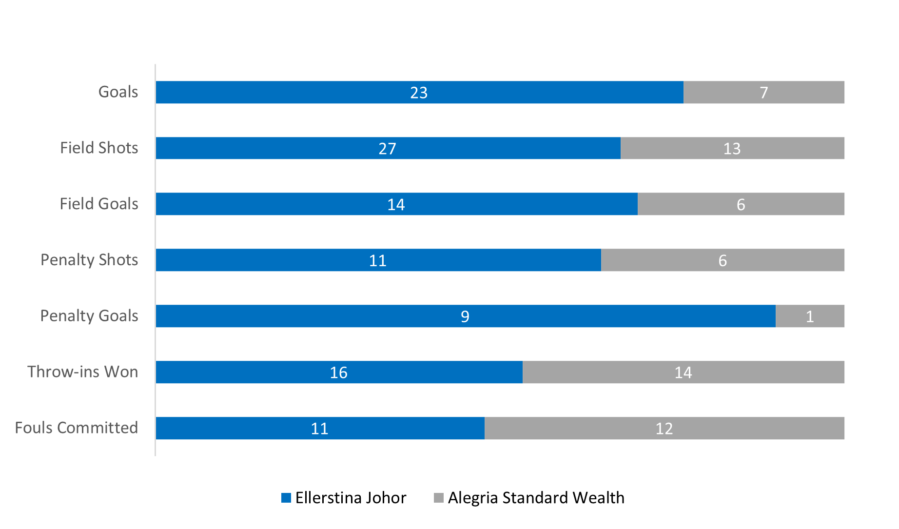 Beginning their title defense, Ellerstina Johor impressed from start to finish in a dominant performance against Alegria Standard Wealth. Facundo Pieres produced 15 goals while shooting an accurate 9 for 11 from the penalty line as Alegria Standard Wealth struggled to match the fast pace set by Ellerstina Johor. Controlling possession with a consistent passing attack, Ellerstina Johor collected nine assists, while holding Alegria Standard Wealth to just two goals in the first half. Returning to the Triple Crown for the first time since 2018, Alegria Standard Wealth ran into an unstoppable force in Ellerstina in the 23-7 defeat.