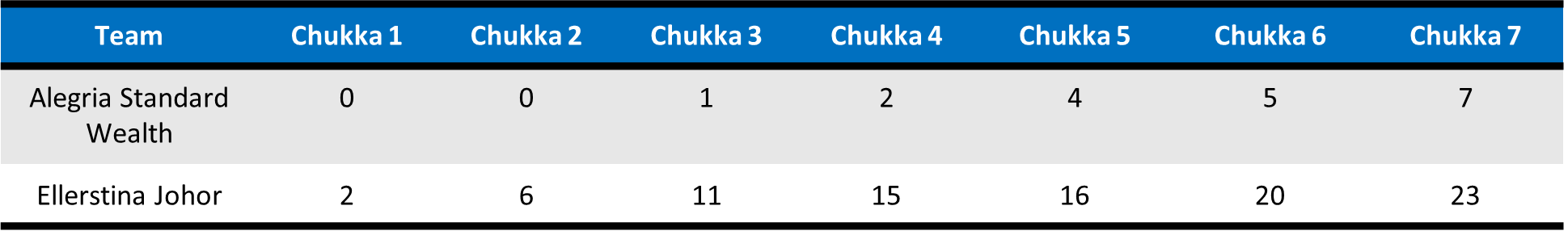 Winning their first chukka of the match, Alegria Standard Wealth received field goals from Mannix and Zacharias in the fifth chukka while holding Ellerstina Johor to just a single goal from Facundo Pieres, but the double-digit difference remained as Ellerstina Johor were two chukkas way from a date in the semi-finals. Forced from the game due to injury, Ulloa was replaced by Matias Torres Zavaleta, who set up Gonzalito Pieres on his first play of the game. Adding three more penalty conversions over the final two chukkas, Facundo Pieres completed Ellerstina Johor’s dominant 23-7 performance.
