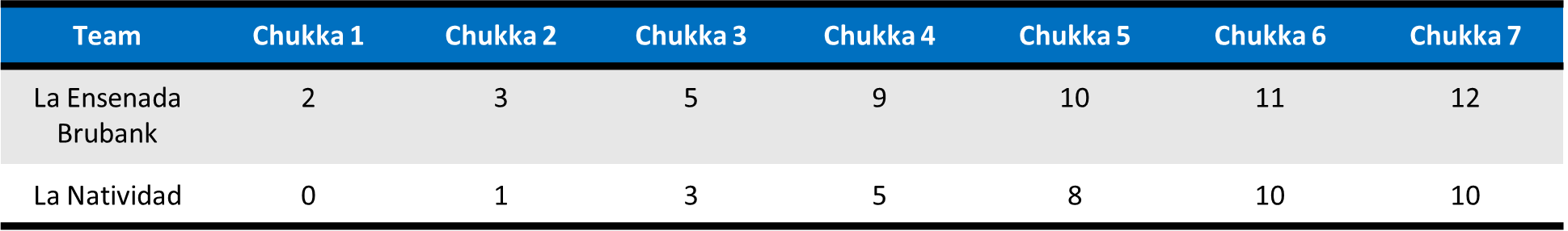 Holding the potent La Natividad attack scoreless, La Ensenada Brubank took the early 2-0 lead in the opening chukka after field goals from Bigatti and Zubia. With del Carril and Zubia headlining an organized defense, La Ensenada Brubank maintained their two-goal advantage through the end of the third chukka. Camilo Castagnola was a standout player in the match, scoring every goal for La Natividad except for one shot that was tipped in by Polito Pieres, yet the complete team effort for La Ensenada Brubank excelled at the end of the half. Producing four goals in the fourth chukka on perfect shooting, Britos provided two goals and two assists during the run to give his team the 9-5 lead.