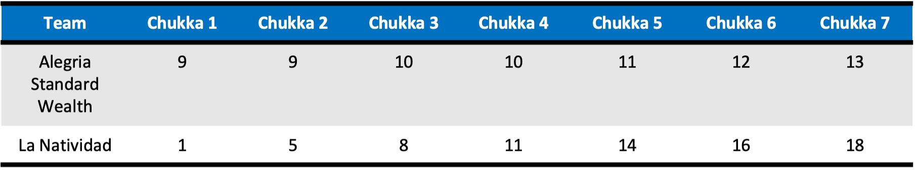 Finding themselves in need to generate any offensive success, Agustín Merlos was only able to convert one goal on three penalty shots for the now trailing Alegria Standard Wealth. Pablo Pieres would continue his offensive tear, with two additional goals in the fifth chukka. Managing to keep Alegria Standard to only one goal in both the sixth and seventh chukkas, La Natividad would reach the goal four more times in the later stages of the match, including Pieres scoring his final of six goals on the day as La Natividad finished the subsidiary semifinal reigning supreme 18-13.