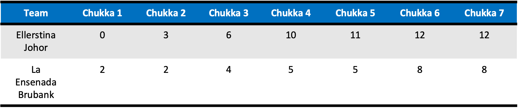 Attempting to cut into their deficit, del Carril, Britos and Zubía would each exchange shots but were ultimately unable to find the goal for La Ensenada Brubank, as Facundo Pieres would be the only player to score in the fifth. Despite Facundo Pieres tacking on another goal, it would be the talent from the mallet of Britos and his three goals in the sixth that would outscore Ellerstina Johor 3-1, taking the chukka for the first time in the match. Defense rose in the final chukka and despite trading ten shots in the final chukka, including six from Juan Britos, neither La Ensenada Brubank or Ellerstina Johor would be able to score. Utilizing an efficient and steady offensive approach from the start, Ellerstina Johor were able to take the lead from the second chukka and never look back, finishing with a 12-8 final score and emerging as the first team to advance to the finals.