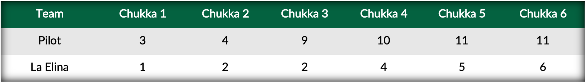 Extending on his Gauntlet scoring lead in the opening chukker, Facundo Pieres stole the ball near midfield and completed the breakaway run to give Pilot the 1-0 lead just 45 seconds into play. Adding two more goals in the first chukker, Pieres drive the Pilot attack forward while holding La Elina to just a single goal from Jared Zenni. Withstanding the early pressure from Pilot, La Elina’s Facundo Obregon brought his team back within one in the second chukker. After restoring their two-goal lead, Pilot exited the second chukker break with a relentless offense that broke the game open. Scoring five consecutive goals on perfect shooting from the field, three goals from Pieres along with one goal each for Mackenzie Weisz and Matias Torres Zavaleta resulted in a 9-2 lead in favor of Pilot at halftime.