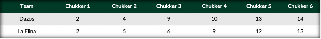 In the second match of Tuesday’s doubleheader, La Elina and Dazos initiated play matching each other stride-for-stride. Trading goals in the first chukker, the high scoring first half featured a balanced offensive effort from La Elina’s Zenni and Coppola. Breaking through in the second chukker, Dazos’ Pieres took control scoring six goals on seven shots, including three at the penalty line to give his team a 9-6 advantage at the half. Pushing back in the second half, a three-goal forth chukker for La Elina was complimented with three goals more goals from another team effort of Coppola, Pieres and Hall. Trailing by just one goal to open the sixth, a crucial conversion from Zenni tied the match 13-all, but a Pieres’ eleventh goal on the day delivered Dazos the thrilling 14-13 win and their first victory of the Gauntlet.