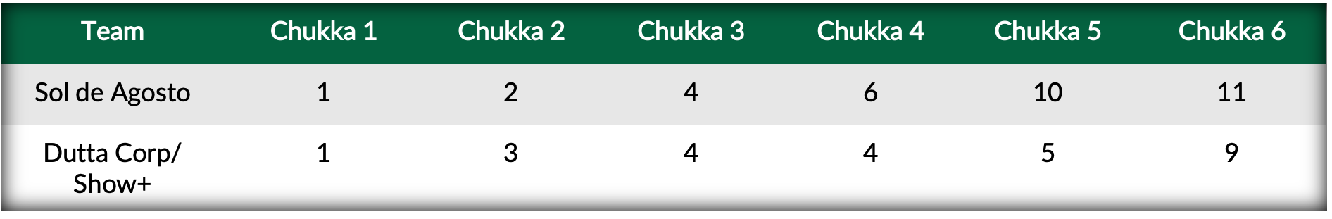 As heavy rain began to douse the fields at IPC, Nero utilized Sol de Agosto’s late third chukker motivation to initiate a stunning seven goal run for Sol de Agosto. Following two brief rain delays, teammates Grant Ganzi, Victorino “Torito” Ruiz Jorba and Paco de Narvaez joined Nero in the offensive action for Sol de Agosto, as their dominant play and ability to draw two consecutive Penalty 1 goals allowed them to take a 10-4 lead. Despite battling both a unified Sol de Agosto and challenging weather conditions, Dutta Corp/Show+ remained determined to pull their team back into contention. Finally halting the push from Sol de Agosto, Laprida hit back-to-back goals in the field, while Garcia del Rio converted his second penalty goal of the day. Despite Laprida ending his day with six goals, including a drawn Penalty 1 of his own at the end of the regulation, Dutta Corp/Show+ were unable to answer Sol de Agosto’s second half seven goal performance. Ending the match with each teammate on the scoreboard, Sol de Agosto discovered their rhythm at a crucial time in the tournament, sealing their first victory 11-9.