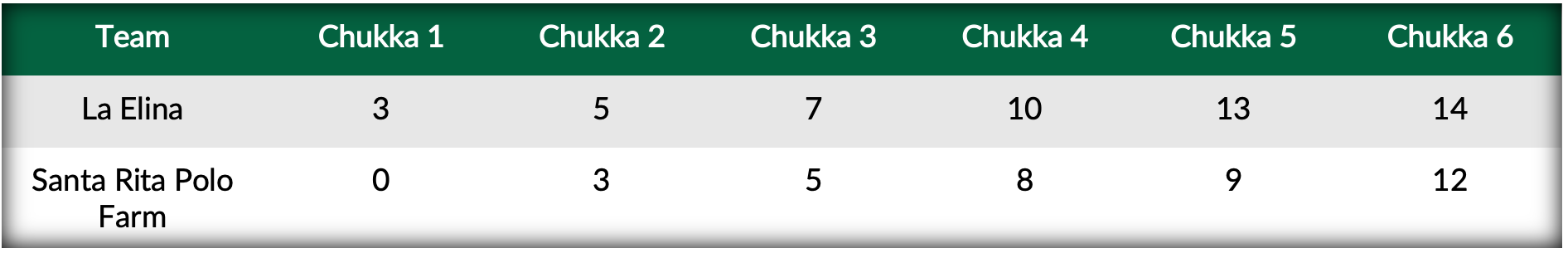 Committing just three fouls in the first half, La Elina’s foul troubles promptly began in the fourth sending Castagnola back to the line for three successful Santa Rita Polo Club conversions in the chukker. Responding with two goals in the field, including Facundo Obregon’s first goal for La Elina, costly defensive mistakes suddenly cut La Elina’s advantage to just two goals. Joining the three Obregon’s on the scoreboard, Jared Zenni opened the fifth from the field, while Juan Martin continued his commanding performance with another two in open play. Leading 13-9 to open the final chukker of the match, La Elina once again got into foul trouble with six total penalties in the chukker, allowing Castagnola to tap in three consecutive conversions to bring Santa Rita Polo Club to just within one goal. Unwilling to let their victory slip away on penalties, one last field goal from Geronimo Obregon in the field eased the errors of the second half to deliver La Elina the 14-12 win.