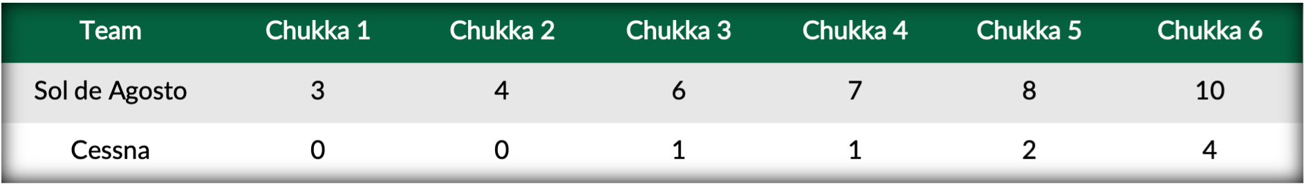 A confident Sol de Agosto utilized their team strength and effective ball circulation to post four consecutive goals with contributions from Narvaez Jr., Victorino “Torino” Ruiz Jorba, and Juan Martin Nero in the final match of the day. Left off the scoreboard in the first two chukkers, Will Johnston finally broke through from the field for Cessna. Quickly responding on a Penalty 2 from Jorba followed by 10-goaler Nero in open play, Sol de Agosto carried a commanding 7-1 lead into halftime.