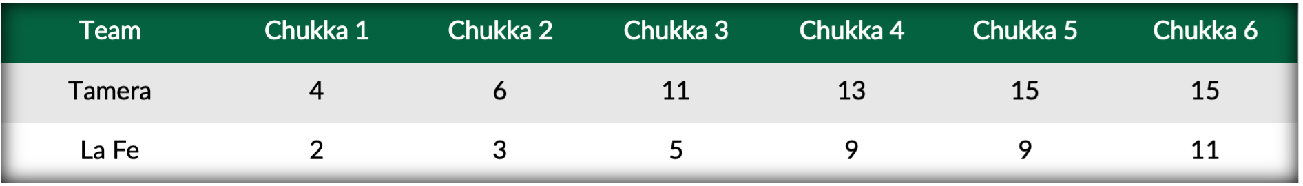 Initiating the scoring for La Fe, team captain and leading scorer Elizalde got his team on the scoreboard first. After the quick start, La Fe surrendered an early Penalty 2 to 9-goaler Diego Cavanagh as Tamera took advantage of their early success from the line into the field for a stretch of back-to-back goals from Segundo Saravi and Cavanagh. Returning to the penalty line, Elizalde and Cavanagh exchanged penalty conversions allowing Tamera to grasp an early 4-2 lead. Following two consecutive goals from Cavanagh and Alejandro Poma, Elizalde answered once again for La Fe with two additional goals of his own to keep La Fe’s deficit to within two. Taking advantage of La Fe’s foul troubles, Tamera ignited their offensive with run of five unanswered goals, including three from the penalty line and a drawn Penalty 1. Trailing by seven goals, Elizalde hit the posts once more to account for his fifth goal of the half, as La Fe entered the break down 11-5.