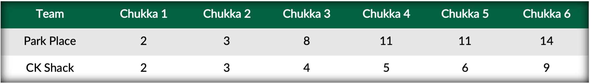 Regrouping in the break, Henry Porter finally created space in the field to drive the ball across the line for a struggling CK Shack, but Park Place immediately responded with Ulloa contributing back-to-back goals, while teammate Ellis tapped in his second goal of the match. Steeping up their defense in the fifth chukker, CK Shack swarmed Park Place and managed to keep them off the scoreboard, as Porter made his third goal of the day in open play. Leading CK Shack by five goals to open the final chukker of regulation, a strong three goal effort from Santiago Toccalino, including two penalty conversions was matched in the field by Ellis and Britos, as Park Place overcame their slow start for the resounding 14-9 victory.