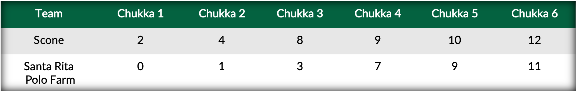 Coming off a thrilling overtime win against La Elina, Scone’s Sapo Caset built off his five-goal performance, finding the posts on back-to-back goals from the field to open the scoring. Holding Santa Rita Polo Farm to just one goal from 10-goaler Polito Pieres in the second chukker, a successful Penalty 4 from Cambiaso and additional Caset field goal gave Scone an early 4-1 advantage. Working in tandem throughout the field, Scone’s team success shone in the third, with goals from Caset, Keko Magrini and Cambiaso taking a firm 8-3 lead into the break.
