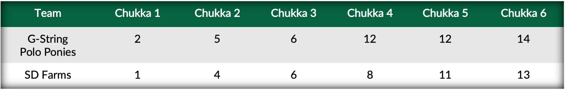 Foul troubles immediately hindered SD Farms to open the second half of play, as Pieres stepped up to roll four Penalty 2 conversions through the posts for G-String Polo Ponies. Vercellino and Zacharias answered with their own Penalty 2 and Penalty 1, however field goals from Pieres and Nico Escobar completed an astounding six-goal fourth chukker for G-String Polo Ponies for the 12-8 edge. Following a substitution of Tommy Huber in the place of Sayyu Dantata, SD Farms rallied in the fifth chukker to account for three goals from Vercellino and Viana to cut their deficit back to within one. Trading goals in the sixth, Viana and de Lusarreta each fought to grab the victory but in the final stages, SD Farms’ Vercellino found the goal to tie the game at 13-13. With a second consecutive overtime looming, Pieres capped off his eight-goal day firing from distance over multiple defenders to send the game winning shot across the line for the dramatic 14-13 victory.