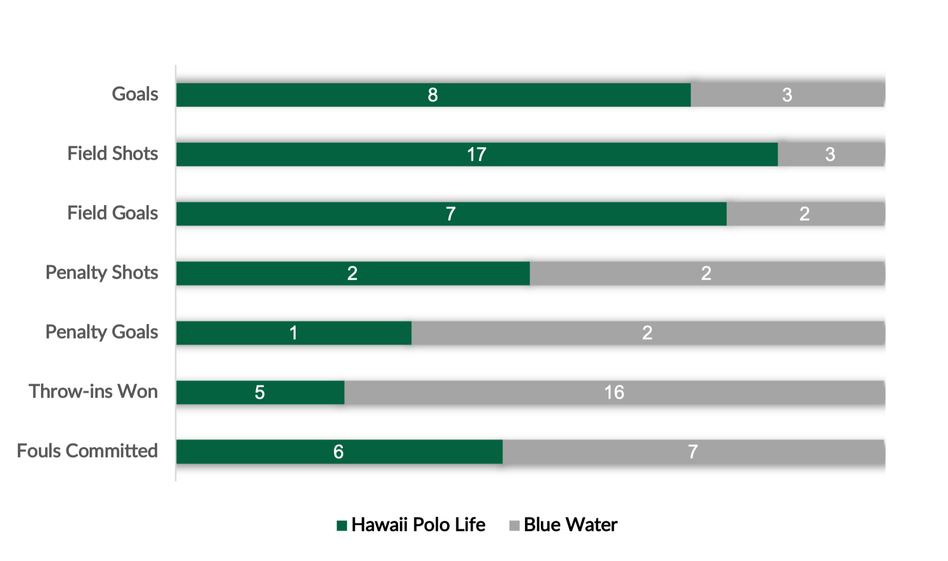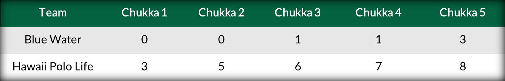 Leading from start to finish, Hawaii Polo Life controlled possession from the opening throw-in to outshoot Blue Water 17-6. With few penalty shots for either team, the game was primarily decided in open play where 10-goaler Hazel Jackson excelled with three goals and four assists to contribute on all but one of her team’s goals. Utilizing exceptional horsepower, Hawaii Polo Life’s built a large lead behind a defense that was equally as strong, limiting Blue Water to just one field goal in the game. With the dominant performance, Hawaii Polo Life completed the five-goal victory to return to the winner’s circle at IPC.