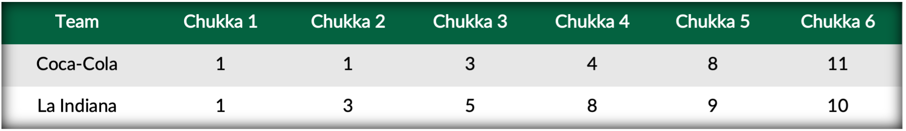 Conceding one goal on handicap to La Indiana, Coca-Cola’s Nico Escobar quickly erased the deficit to tie the match at 1-all. With each team committing eight fouls, scoring in the first half was largely driven from the penalty line, with Jeff Hall and Lucas Criado Jr. sharing the shooting duties to account for four La Indiana goals, while Nico Pieres responded with a Penalty 3 to leave Coca-Cola trailing by two. Receiving a double yellow card, Escobar was relegated to the penalty box late in the third chukker to give La Indiana a one-man advantage for two minutes. However, Coca-Cola stood tall and prevented La Indiana from scoring with their extra man, as Escobar galloped back onto the field to facilitate Coca-Cola’s first goal in open play from Julian de Lusarreta. Following a last-minute goal from La Indiana’s top scorer Criado Jr., La Indiana managed to take a 5-3 lead into halftime.