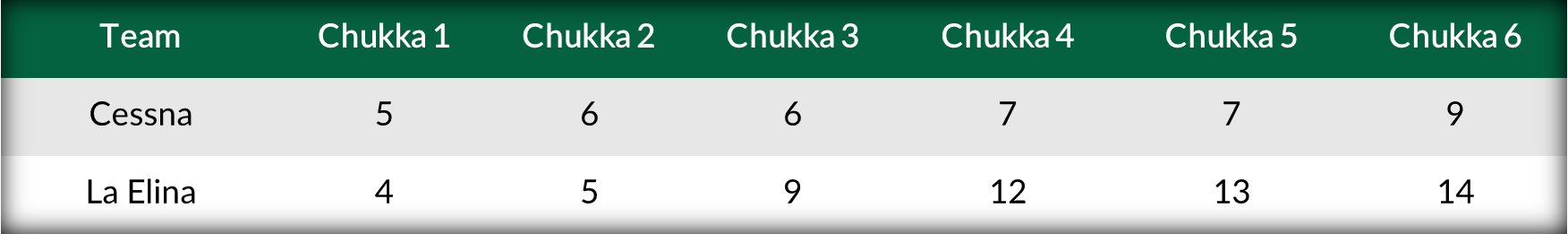 In search of their first victory, La Elina faced a 19-goal Cessna line-up that had Alejandro Novillo Astrada making his debut in place of brother Miguel. Controlling possession, La Elina worked effectively to generate 21 shots at goal compared to just eight for Cessna in their strongest performance of the season. Sapo Caset led all players with eight goals, while all four La Elina players collected at least one assist. Struggling to find chemistry from the field, Cessna was led offensively by four penalty goals from Gringo Colombres, but the discrepancy in open play resulted in La Elina claiming their first win with the 14-9 triumph.