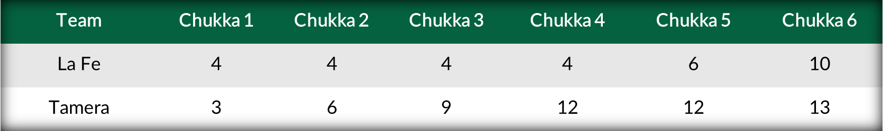 Conceding two goals on handicap, Tamera raced out of the gate with three unanswered goals to quickly turn the two-goal deficit into a one-goal lead, just halfway through the first chukker. Early foul trouble for La Fe resulted in two penalty goals for Saravi, but La Fe reorganized and finished the opening seven minutes with two goals of their own to regain the lead at 4-3. The remainder of the first half belonged to Tamera, as they overwhelmed the La Fe defense to outshoot their opponents 8-1 during the stretch and taking advantage of nearly every opportunity, receiving two goals each from Alejandro Poma, Diego Cavanagh and Segundo Saravi. Unable to find the mark on two penalty attempts, La Fe entered halftime trailing 9-4.