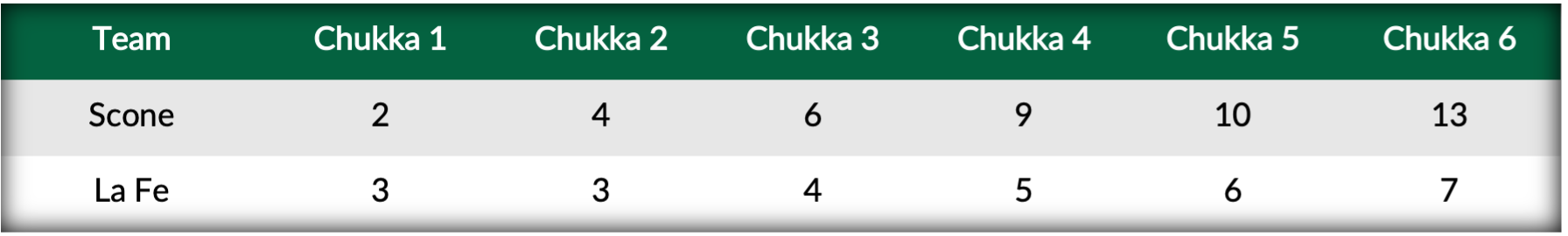 Emerging with fresh horsepower, Scone kept the pressure on La Fe with 44% shooter Poroto Cambiaso creating space between defenders to add an additional goal for Scone, while Magrini broke through La Fe’s Bilbao to send the ball through the posts for his first field goal on the day. Facing a five-goal deficit following a Penalty 4 conversion from Poroto Cambiaso, La Fe’s Lucas Diaz Alberdi halted Scone’s five goal blitz on a powerful play to the posts. Contributing as an efficient back, Adolfo Cambiaso’s shooting accuracy was once again on display as he took advantage of a defensive gap on a booming shot from almost mid-field to score his first goal in two games. Attempting to keep themselves in contention, La Fe’s leading scorer Elizalde cruised to his fourth of the match, but the power and tempo of Poroto Cambiaso in the final minutes of regulation was no match for the 20-goal La Fe, as Cambiaso added an additional three goals from the field to deliver the 13-7 victory for Scone.