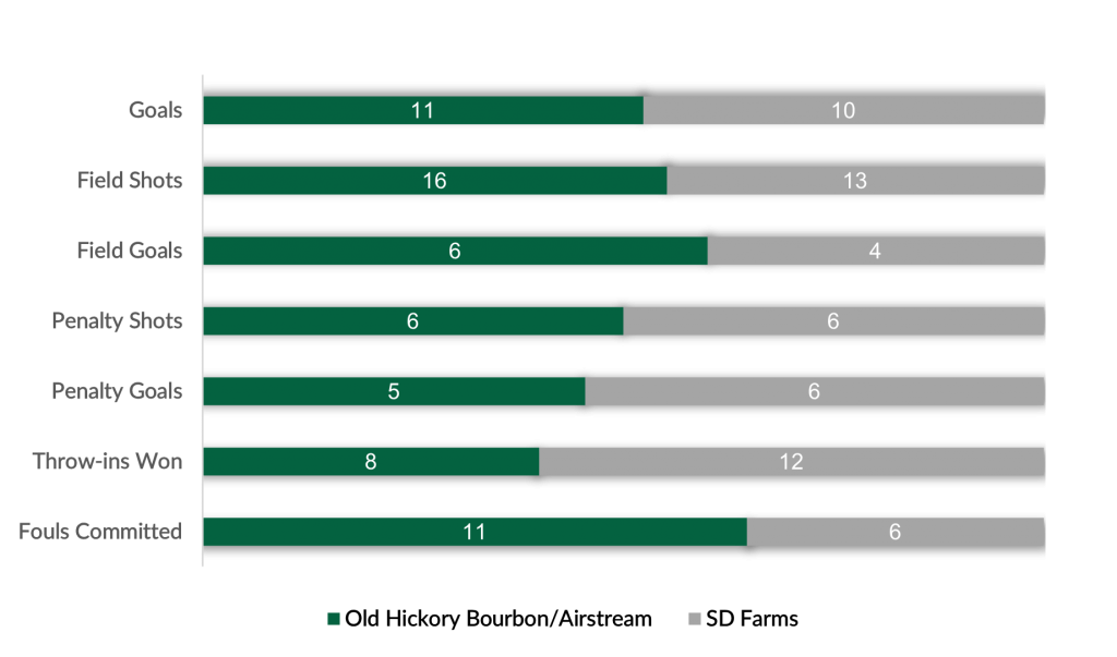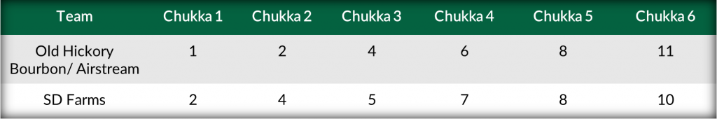 Trailing throughout much of the game, Old Hickory Bourbon/Airstream remained within reach with a combined team effort that featured at least two goals from all four players. Gaining their first lead of the game in the sixth chukker, Old Hickory Bourbon/Airstream’s resilience paid off with Stevie Orthwein coming forward to score the final two goals for his team. SD Farms were just steps away from victory, led by perfect 6 for 6 penalty shooting from Felipe Vercellino, who finished with a game-high seven goals, but the final chukker surge from Old Hickory Bourbon/Airstream secured the victory in the first play-off game.