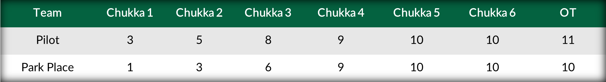 Awarding Pilot one goal on handicap, a collision between Park Place’s Cody Ellis and Pilot’s Matias Torres Zavaleta, resulted in a double yellow card and Penalty 2 in favor of Pilot. Following a successful Penalty 2 conversion from Pieres, Park Place found themselves trailing 2-0, while facing the challenge of defending Park Place shorthanded for two minutes. Pieres struck once again for Pilot on their advantage, however the return of Ellis allowed for Josh Hyde to score the first goal for Park Place at the end of the first chukker but remain trailing 3-1. Pilot continued to generate offense from the penalty line with four penalty goals for Pieres in the first half, but Juan Britos helped bring Park Place back within reach, scoring three field goals over the second and third chukkers. A choppy third chukker resulted in two penalty conversions for each team, leaving Pilot ahead 8-6.