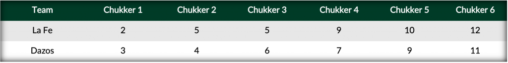 Taking to U.S. Polo Assn. Field One, Dazos pulled out to an early lead in the Featured Match of the Week on goals from Farache, Pieres and Rossiter. Answering for La Fe, leading tournament scorer Elizalde got off to a hot start going 4 for 5 in open play, but two more from Torres and Pieres gave Dazos a slim 6-5 lead at the half. Emerging from the tent, Elizalde added three more goals to kick-off the second half, as Rossiter dug in for Dazos to keep his team within one. With the possibility of overtime looming, the two evenly matched teams traded goals from the field, as La Fe was ultimately able to hang-on and claim the 12-11 victory.