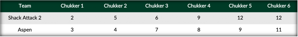 Hoping to build on their previous victory against Pilot, Rufino Bensadon once again provided Aspen their offensive spark, giving his team an early 3-0 advantage. Winless in bracket play, Shack Attack 2 came into the playoffs with the addition of Matias Magrini and an efficient response from the field on three-goals from Weisz. Trading the lead for the third time in the contest, two more off the mallet of Rufino Bensadon combined with a field goal from substitute Gonzalez allowed Aspen to take a narrow 7-6 lead at the horn. Regrouping in the break, Kampsen responded in the fourth with three unanswered goals, as Magrini and Valent got in the action to lift Shack Attack 2 back into the lead. Despite a two-goal effort from leading scorer Bensadon in the sixth, Shack Attack held on to secure their place in the quarterfinals with the 12-11 win.