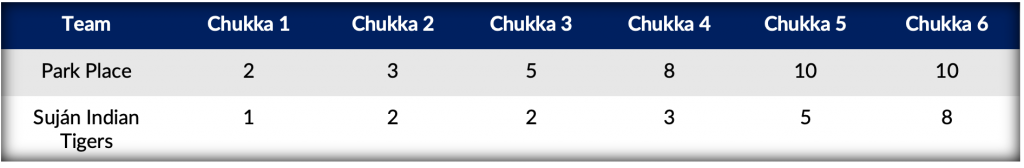 Capping off the doubleheader, Pieres kicked-off the scoring for Park Place with Hine and Bayugar countering for Suján Indian Tigers. Unable to take advantage at the penalty line, Suján Indian Tigers struggled on their first half conversion opportunities, as Pieres accounted for four goals to give Park Place a 5-2 lead at the break. Maintaining their efforts in the second half, Perry and Borodin added their names to the scoreboard for Park Place. Making a comeback push for Suján Indian Tigers, a five-goal effort including two off the mallet of Bayugar ultimately fell short, as Park Place held on for the 10-8 win.