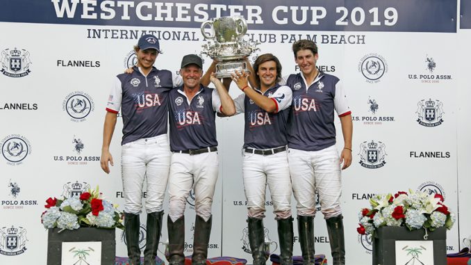 On the heels of last weekend’s repeat Junior Westchester Cup win, USA entered the Westchester Cup determined to defeat the English on Sunday, April 28, at the International Polo Club Palm Beach in Wellington, Florida. Waging the historic challenge on the international stage of the U.S. Polo Assn. Field, England brought Henry Porter, Ollie Cudmore, Jack Richardson and Tommy Beresford from across the pond. USA, represented by Mike Azzaro, Peke Gonzalez, Geronimo Obregon* and Jared Zenni*, found themselves in a pulse-pounding overtime chukker, Obregon delivering the final goal to capture the Westchester Cup 9-8 for the first time since 1992.