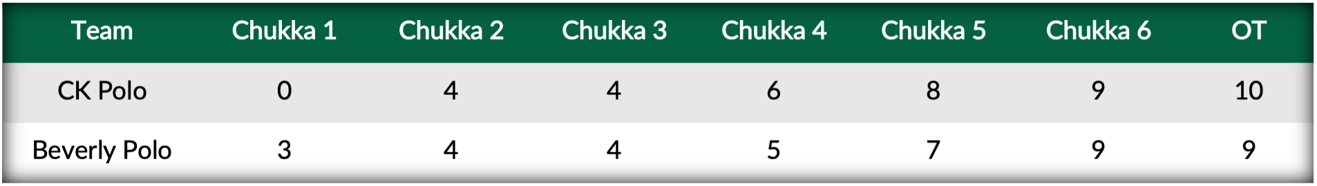 Despite Ocampo Jr. hitting a Penalty 2 to begin the fourth chukker, two missed Penalty 4’s for Beverly Polo allowed CK Polo to rebound off Ocampo Jr.’s struggles from the 60-yard line, as Keko Magrini found the goal on two consecutive goals from the field. Back-and-forth play continued in the fifth chukker with two goals from each team, including Joaquin Panelo’s first of the day to give CK Polo an 8-7 lead going into the sixth. Joaquin Panelo would strike once more for CK Polo in the final chukker of regulation, but Beverly Polo’s Hilario Figueras made two crucial goals from the penalty line to force overtime. Finishing just 5 for 12 on their penalties, Beverly Polo were unable to claim the victory in regulation and sent Keko Magrini to the penalty line to decide the game. Just moments into overtime, Magrini stepped up to hit the Penalty 4 to score the golden goal for a 10-9 victory.